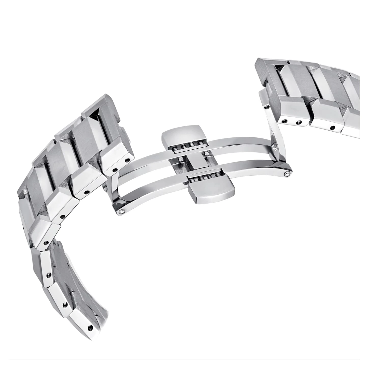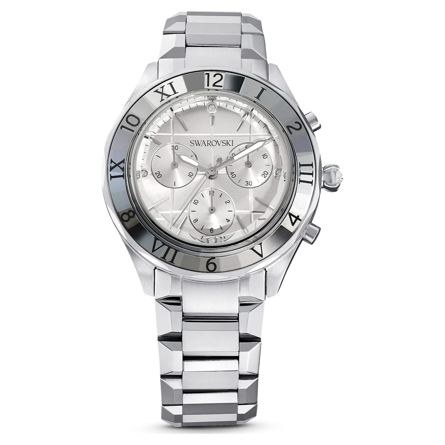 This bold Swiss Made chronograph will help you make the most of every hour. Distinguished by its 39 mm faceted case and multi-linked bracelet in stainless steel, the metallic styling is heightened by a silvery bezel featuring Roman and Arabic numerals, as well as a silvery dial that is given extra dimension through its grid pattern, three counters, crystals for index markers, and a single stone in the crown. An industrial-chic piece from the Dextera family. Water-resistant to 50m.