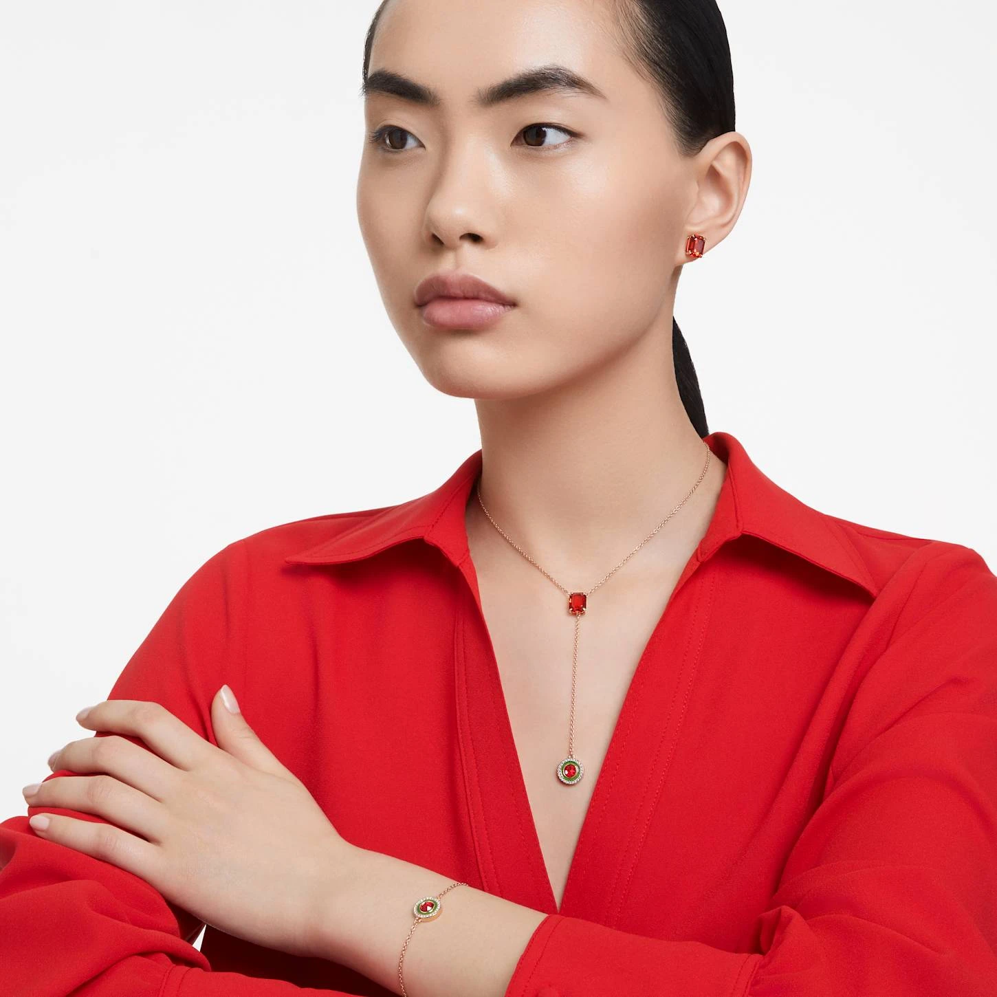 Achieve your own style harmony for Chinese New Year with this beautiful set containing a matching necklace, bracelet, and earrings. The rose gold-tone plated designs are distinguished by their auspicious red colorway and alluring combination of stones. The pendant necklace features an octagon-cut stone in red and a round pendant with clear pavé and a central red stone. The stud earrings also feature an octagon-cut red stone, while the bracelet mirrors the round motif on the pendant and includes a sliding closure for the perfect fit. Choose this set for instant wonder during the celebrations, or choose it as a gift for the Year of the Rabbit.