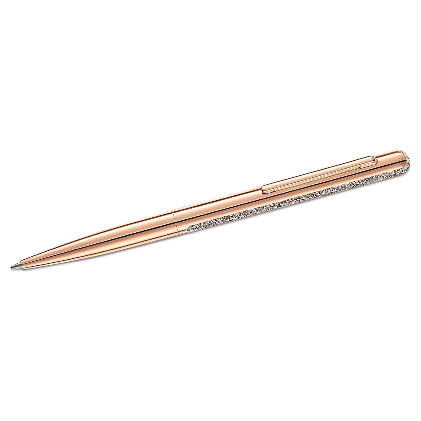 This rose-gold tone plated Swarovski ballpoint pen combines a slender, streamlined silhouette with a modern, minimalistic aesthetic. The highlight of the design is a sparkling strip of rose-gold tone crystals in our ultra-fine Crystal Rocks technique, which runs along both sides and over the end of the pen. Delivered in an elegant pouch, the pen also features a rose-gold tone plated metal clip and barrel. The Swarovski logo appears on the barrel and the high-quality ink cartridge can be replaced easily. An ideal gift for any occasion.