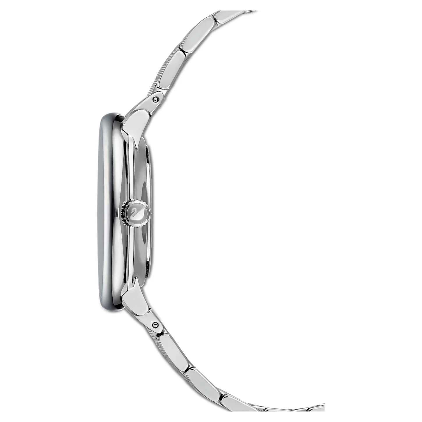 The design for this watch by Swarovski is inspired by the serene beauty and purity of raindrops. This imagery is emphasized by the flowing shape of the stainless steel case, which is filled with approximately 1,000 sparkling crystals. The silver-tone sunray dial and the sparkles create a unique contrasting brilliance. Meanwhile, a shimmering bracelet secures the watch to the wrist, making it an elegant addition to your everyday outfits.