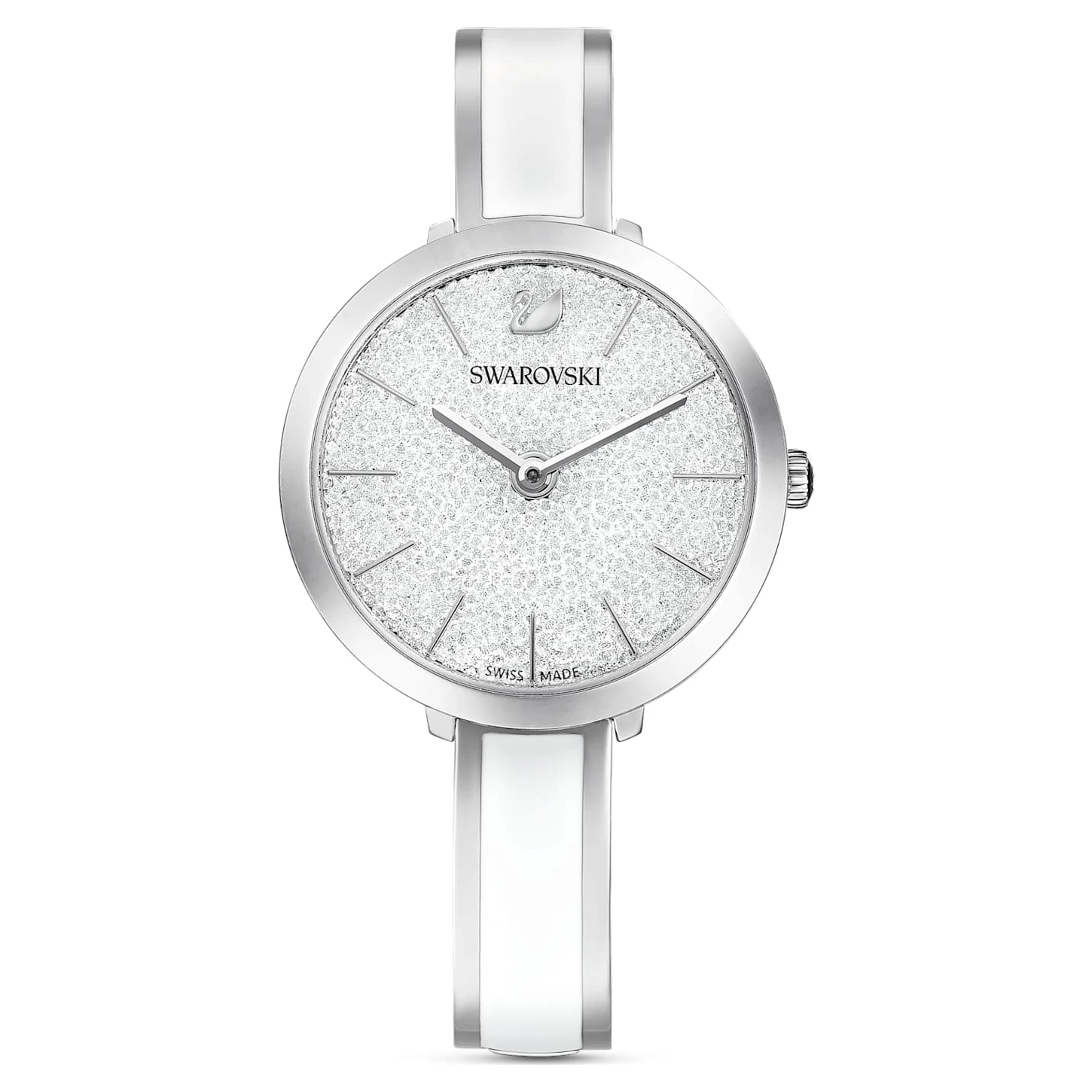 Effortlessly chic, this easy-to-wear Swarovski bangle watch is infused with iconic Crystalline sparkle. Its modern dial and elegant stainless steel case, filled with approximately 1,000 clear crystals, shimmers with fresh brilliance. The jewelry-inspired bangle, also crafted in stainless steel, is finished with a minimalist design in lustrous white enamel. A perfect accessory to style this season and beyond, the watch is made in Switzerland and water resistant to 50m. Adjustable links ensure it will fit any wrist size. Swiss Made.