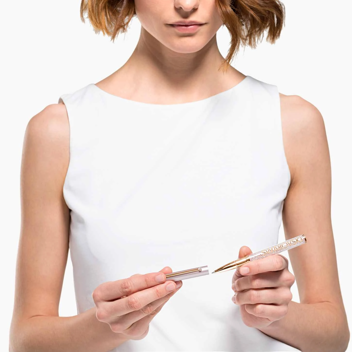 This Swarovski ballpoint pen was inspired by color codes and silhouettes from the cosmetics industry and is perfect for modern women with a feminine style. Its barrel is filled with hundreds of glittering crystals using the iconic Crystalline technique. The pen features an eye-catching vintage rose lacquered cap adorned with a vintage rose crystal, and its high-quality ink refill can be replaced. Crystalline Gloss ballpoint pens are a stylish addition to your office and make charming gifts.