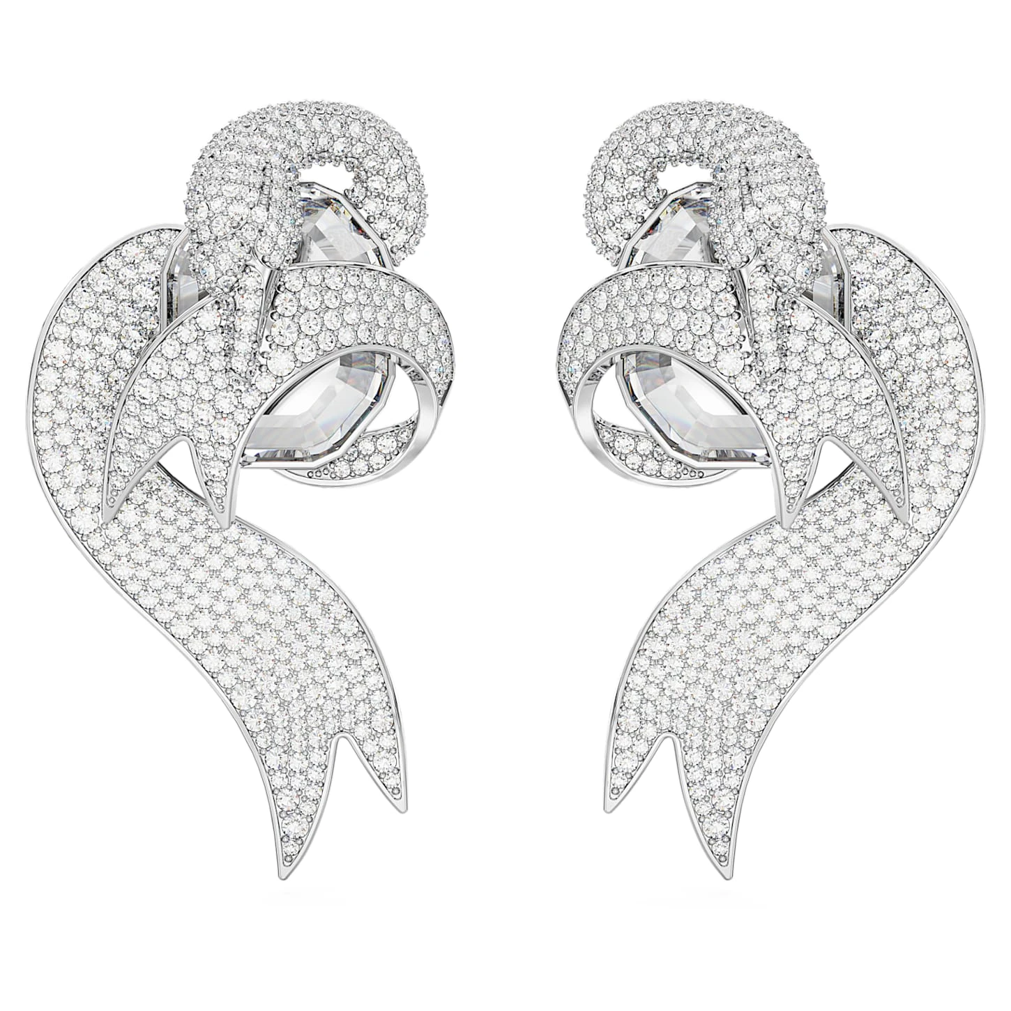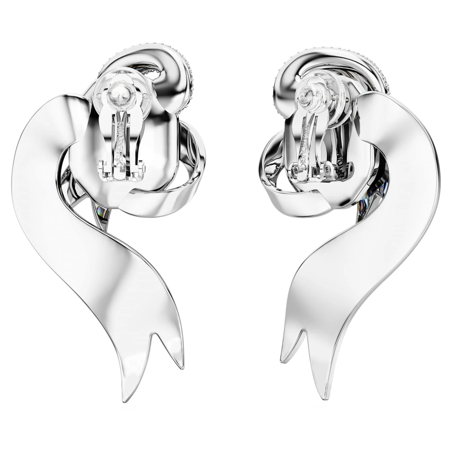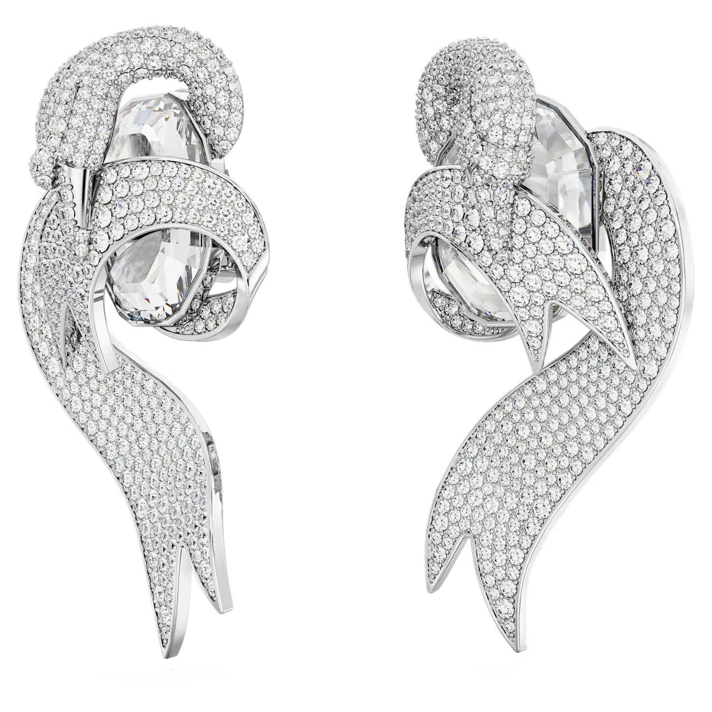 These unique clip earrings artfully capture the graceful movement of the Swarovski Swan. Each rhodium plated piece features a large octagonal stone at the center, surrounded by curlicued ribbons and a refined swan neck, all embellished with round crystals set using our patented Pointiage® technique. Wear these earrings for a special occasion to exude a true sense of luxury.
