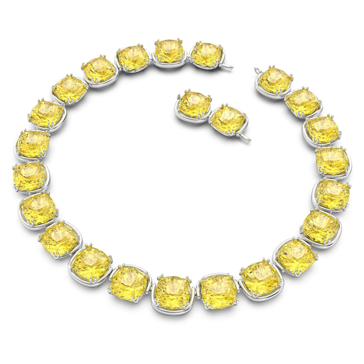 Designed to give the illusion of floating stones, this all-around choker will make an iconic addition to your jewelry collection. Showcasing classic, cushion-cut, yellow crystals in a contrasting, rhodium-plated setting, this versatile piece can be styled for day or night, solo or stacked, to bring a sense of mystery to any look. This necklace is part of the Harmonia family, designed by Creative Director Giovanna Engelbert for Collection II. How to close and open it: place the rounded baton into the widest point of the opposite hole and slide it down to the lowest point. Once in place, lower the D-ring security catch on top to secure the fastening. To open, lift up the D-ring security catch and slide the baton towards the widest point to release.