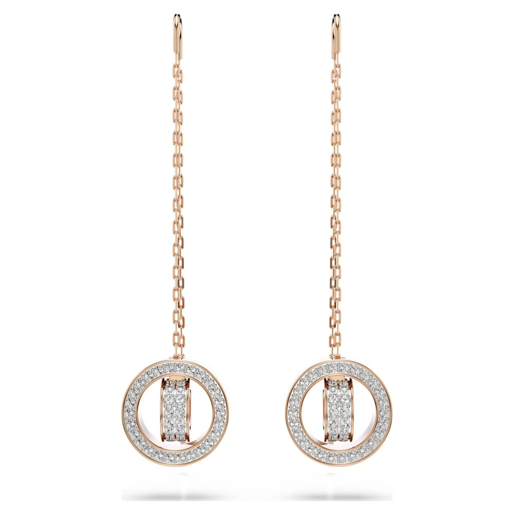 Express yourself with these statement drop earrings. Embellished with crystal pavé, this modern design features interlocking circles suspended from a rose gold-tone plated chain marrying intricate craftsmanship with statement style.