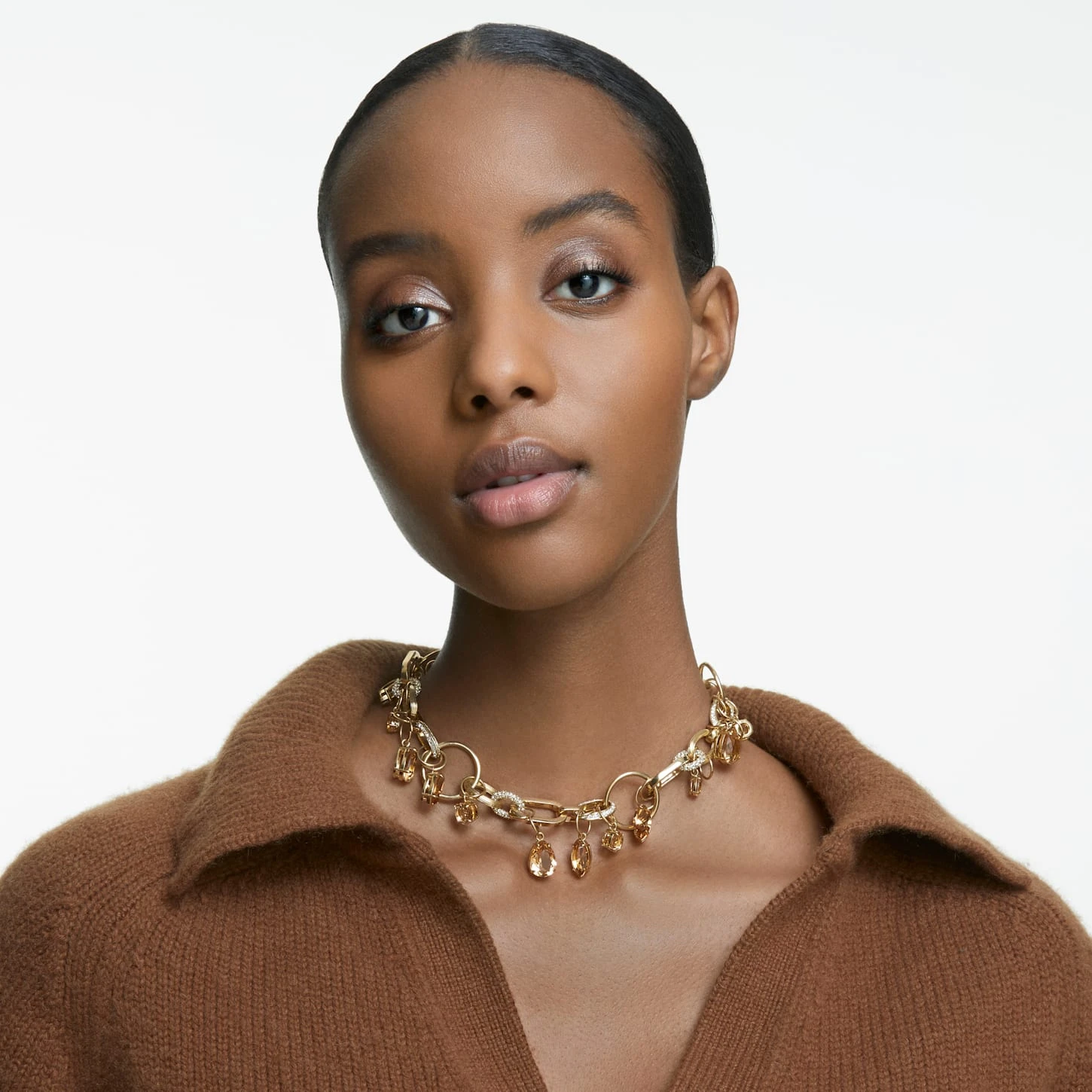 The classic chain necklace gets a contemporary update in this unique design. Highlighting Swarovski’s industrial influences, this gold-plated piece features mixed chain links adorned with elegant drop crystals in an earthy brown hue for an innovative spin on refinement. Wear yours solo or styled with other pieces from the Imber family for maximum impact. This necklace is part of the Imber family, designed by Creative Director Giovanna Engelbert for Collection III.