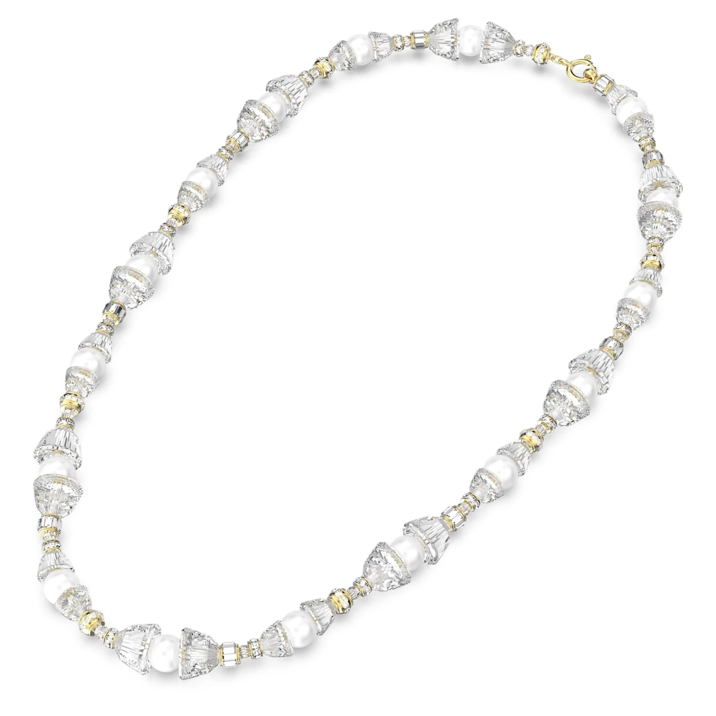 The magic of crystals meets with the luster of pearls in this matching necklace and bracelet set. Inspired by bohemian bead work, both pieces are formed from a delicate gold-tone plated chain, embellished with clear crystals cradling mother of pearl beads. Worn together or as separates, this set will add an eclectic yet modern edge to everything you choose to wear it with. This necklace is part of the Somnia family, designed by Creative Director Giovanna Engelbert for Collection I.