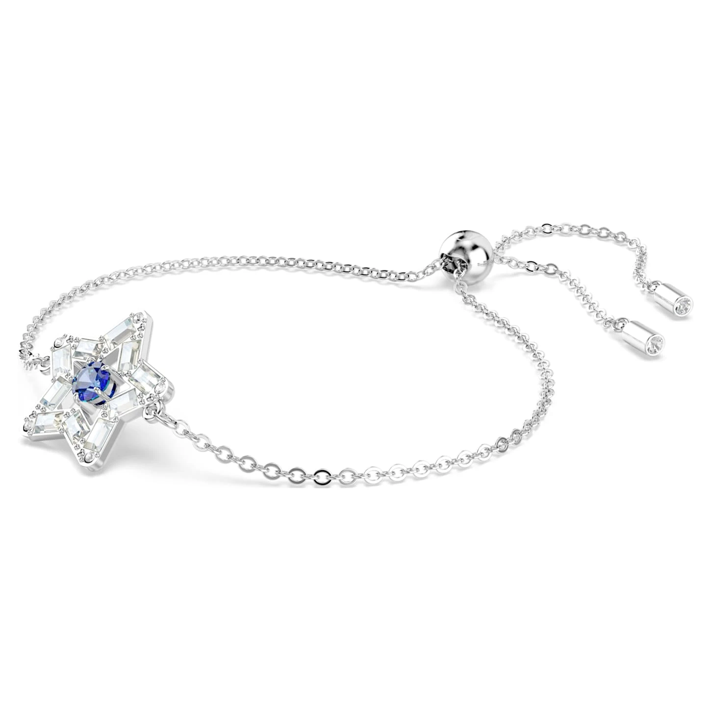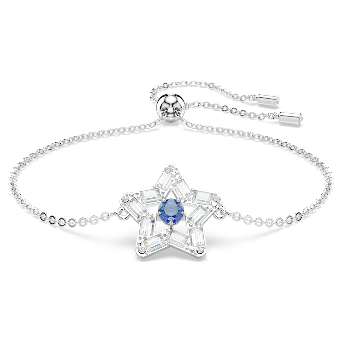 Dare to dream big with this star-shaped bracelet. Designed to captivate with a blue dancing stone, this contemporary piece is finished with a sleek rhodium plated setting and sliding ball closure for a customized fit. Wear it with the matching necklace from the Stella family for a spellbinding combination.