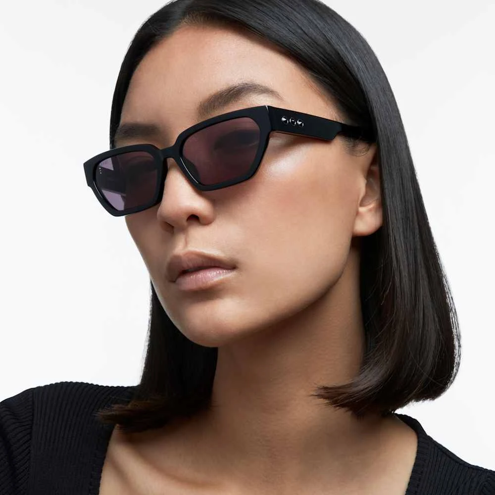 These black, narrow cat-eye sunglasses are a twist on a wardrobe classic. Crafted from black acetate, with smoky gray lenses, the temples are adorned with three jet-black Swarovski crystals. Whether worn in the daytime for the beach, or teamed with a cocktail dress for after hours, you’ll reach for these sunglasses time after time.